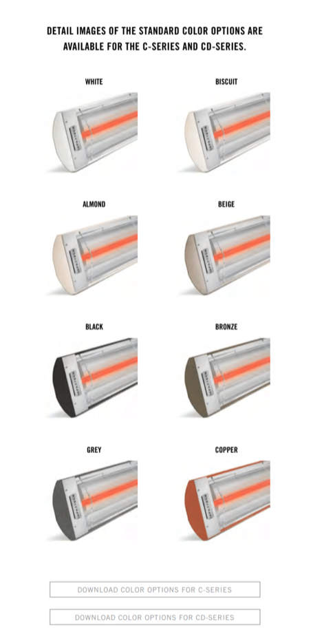 These Standard Colors are powder coated over the stainless steel and baked to achieve a long-lasting, fade- and corrosion-resistant finish. Infratech also offers custom finish colors which can add 3-4 weeks to delivery.