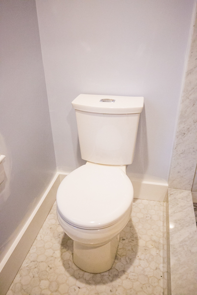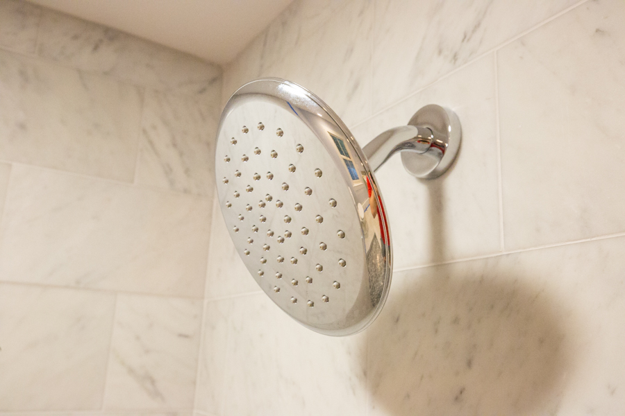 For the shower, we went with the Fluent showerhead, which pairs nicely with the Portsmouth fixtures. Connected to the shower wall by American Standard’s clean, go-with-anything Modern Shower Arm, it offers a great shower, with a steady, even flow and perfect water pressure due to a pressure-compensating flow control device in the shower head itself. This is a huge upgrade from our old shower head, which only offered two settings: sad-dribble-of-water setting, and sandblasting-off-your-nipples setting.