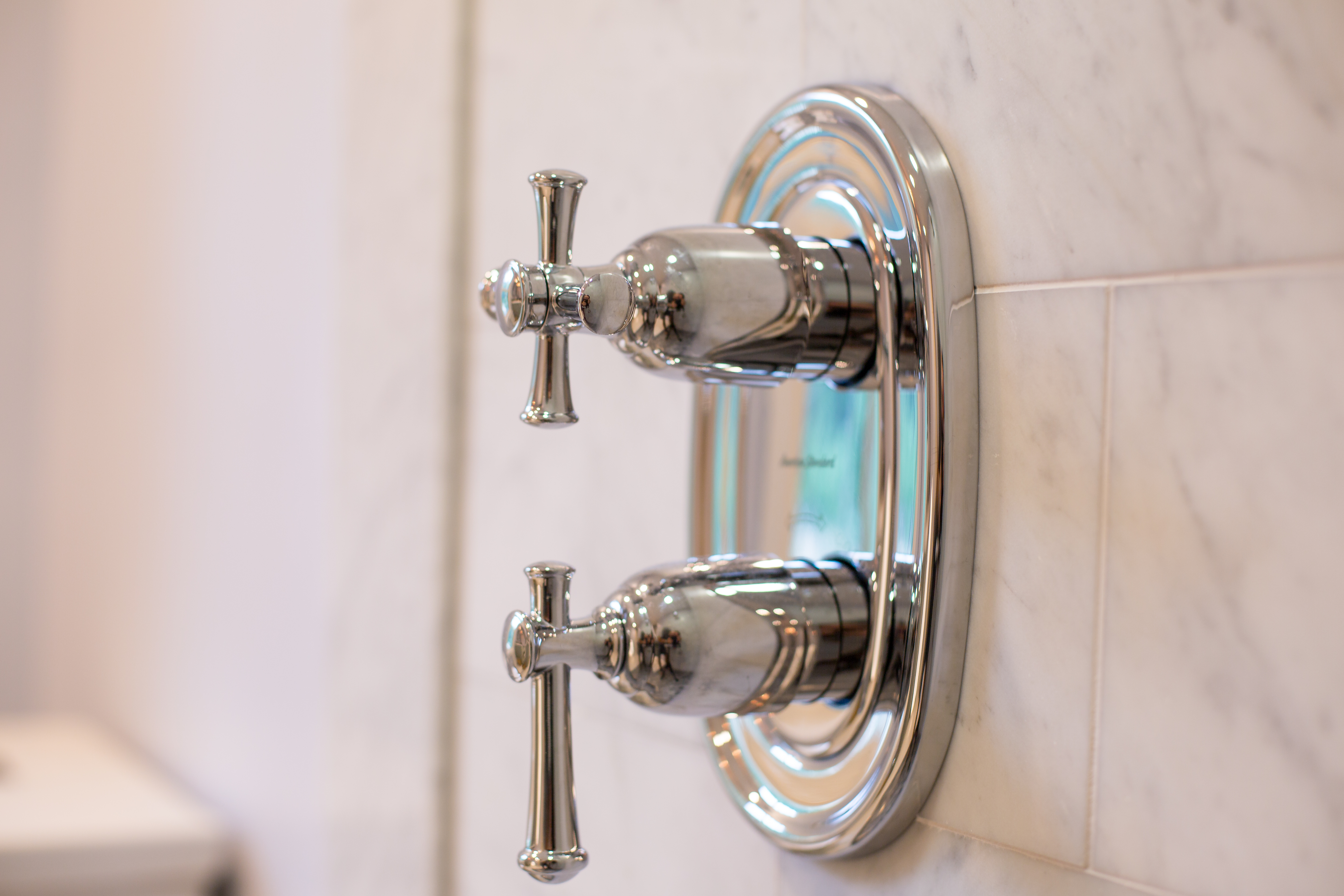 But perhaps my favorite piece of bath hardware is the Portsmouth two-handle shower trim and valve kit. This piece of hardware allows us to set a temperature for the shower with the lower, lever handle, and control the volume of the water with the upper, cross handle.