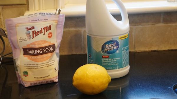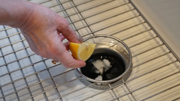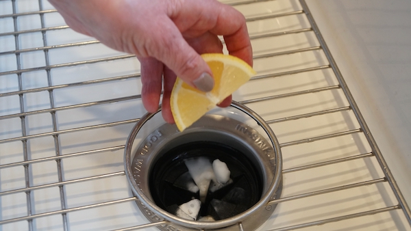 Ice cubes help break up any food and slime stuck to the disposal, while baking soda and bleach kill germs, and the lemon deodorizes it.