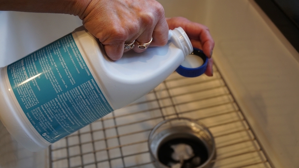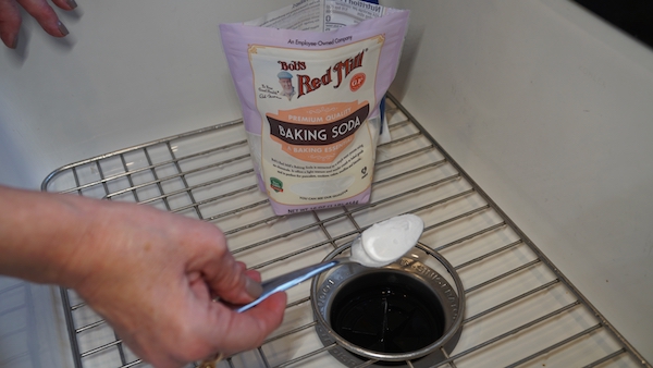 - With the disposal and faucet turned off, put approximately six ice cubes in the disposal chamber. Add approximately 1 tablespoon of baking soda, and bleach. Add lemon and then approximately six more ice cubes.