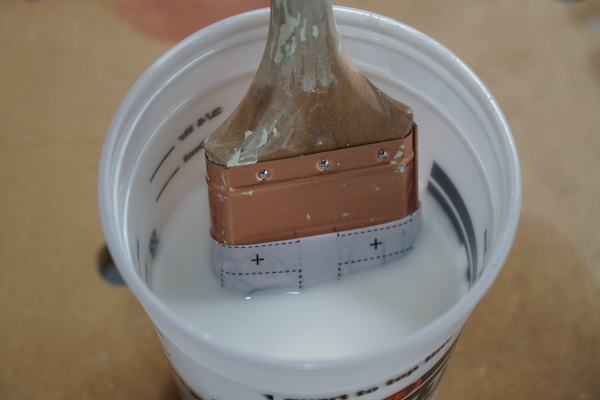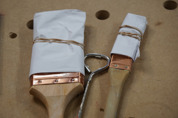 One of the first things I do when done using a brush is to wrap it in newspaper and set it in a quart container of paint thinner, to soak. Ensure you fill the container to cover the brush ferrules and let the thinner do its job.