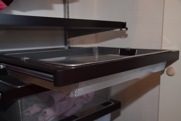 Elfa has several models and options for you to choose from. Having an idea of the style you want will definitely speed up the process. In this installation, my customer chose the Elfa Easy Hang system with Walnut fascia and platinum ventilated wire shelves. Also included were several platinum sliding draw systems and clothes rods. A nice system!