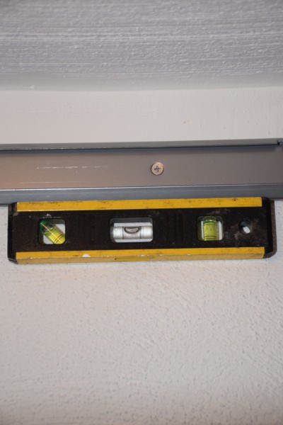 You will receive a custom length top track that will come with holes pre drilled. There are several types of fasteners they offer, and you will need to know what you are mounting to. We mounted our system over textured plaster with the hopes of hitting a few studs along the way. Elfa supplied drywall and plaster anchors as well as wood screws. Making sure your top track is level is probably the most important part of this whole closet system installation! A stud finder is helpful too!