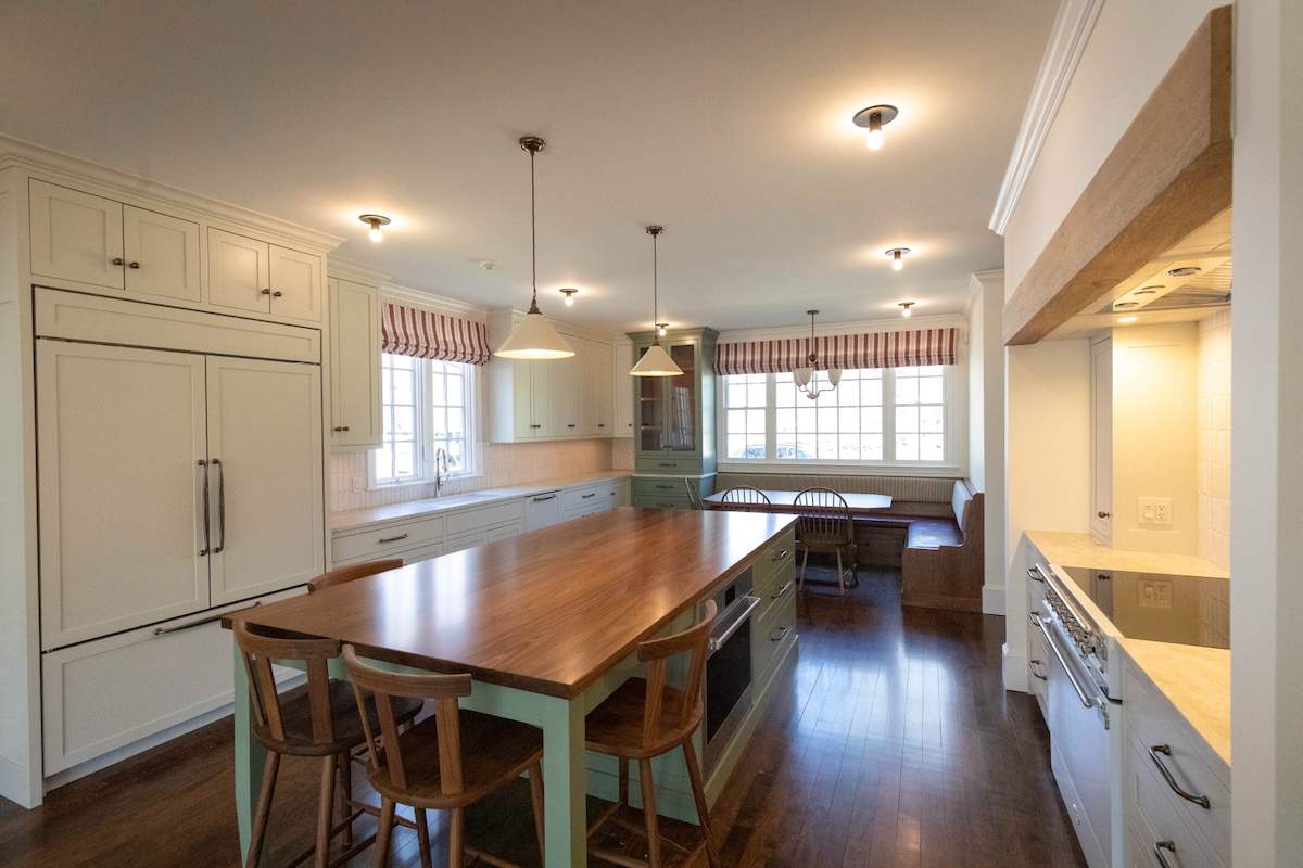 Custom Kitchen: A spacious, three-sided island with quartzite and walnut countertops, complemented by a cozy, family-friendly banquette.