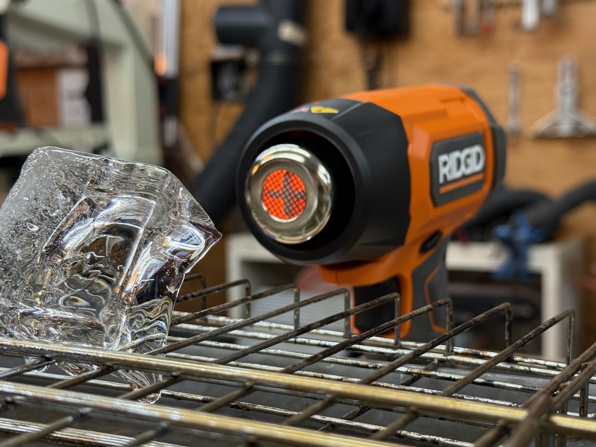 We used 2-inch ice cubes placed on a grilling rack, positioning the heat guns at the same distance from the center of each ice cube. We then recorded the time it took for the ice cubes to melt.