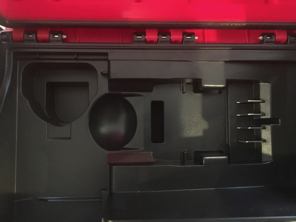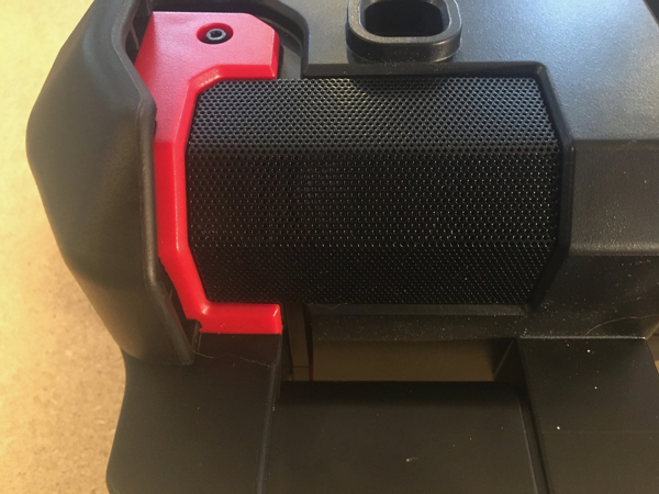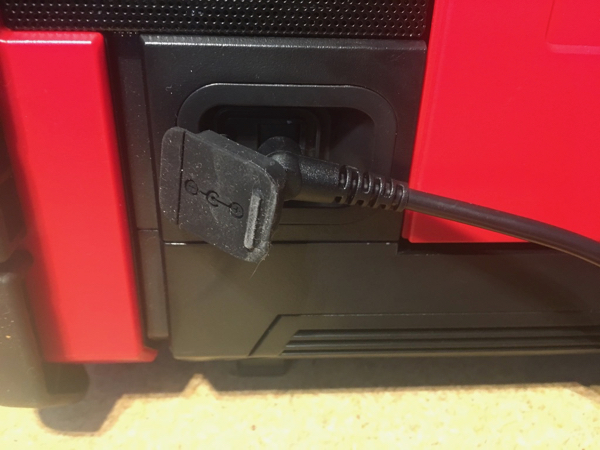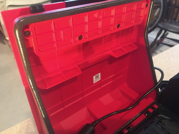 Behind the red plastic latched door on the front of the Connect Radio, there is a large storage compartment that serves many purposes. The entire underside of the storage compartment door has a weather seal to keep out dust and water. The storage compartment is designed to simultaneously hold the 20V battery and the AC adapter.