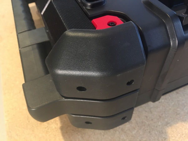 Each of the 4 corners had 4” x 3” pieces of rubberized plastic to cushion and protect the unit from falls. Additionally, these bulky corners raised the unit 0.5” off the ground when the Radio was placed standing up, which would certainly protect it from any spills or debris on the ground. On the bottom of the unit there are 4 feet that raise the unit 0.75” off the ground when laid down flat, or the feet can be used to stack the Connect Radio on top of other Craftsman VersaStack products.