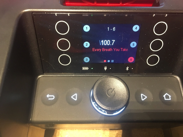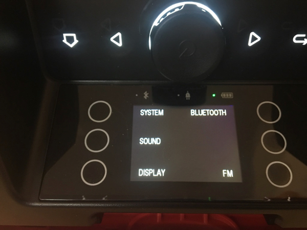 When using the FM radio as the source, the screen indicates the radio frequency, the artist, and the name of the song. Around the full color screen are 6 buttons that can be used to save 12 different radio stations. The screen also indicates the power source and if Bluetooth is currently connected. Surrounding the power/volume button are 4 more buttons. The Back button brings you back a screen.