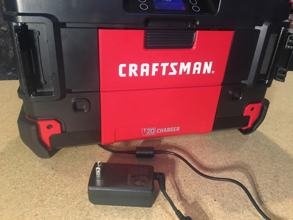 If a battery is connected while the AC/DC power adapter is plugged in, that battery will charge until it reaches 100%. I used a Craftsman 20V Max 2.0Ah Lithium-ion battery for my 3 weeks of testing and it usually powered the Connect Radio for approximately 5.75 – 6.5 hours at varied volume levels using all 3 audio inputs. I would have liked a longer battery life from this 20V Max 2.0Ah battery, but Craftsman does estimate a fully charged 20V Max 4.0Ah Lithium-ion battery will run for approximately 9 hours.