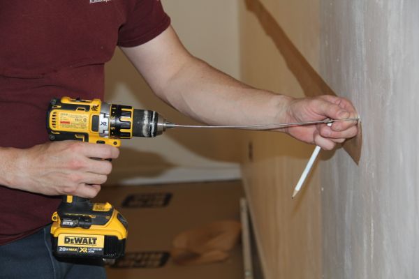 Once I have determined my opening size, I used 16-inch long metal, insulation support rods to drill, at each corner, through to the opposite side of the wall. This gives me four points to “connect the dots” and draw my cut lines.