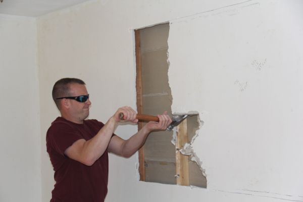 Once the cutting if complete, use a hammer to lightly tap along the cut lines and then use a pry bar to pry the board off the studs in large pieces. Once one piece is off, the rest can be pulled off the wall studs by hand. The wall board will break off along your cut lines, leaving you an opened cavity.