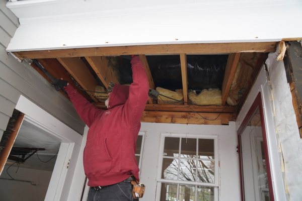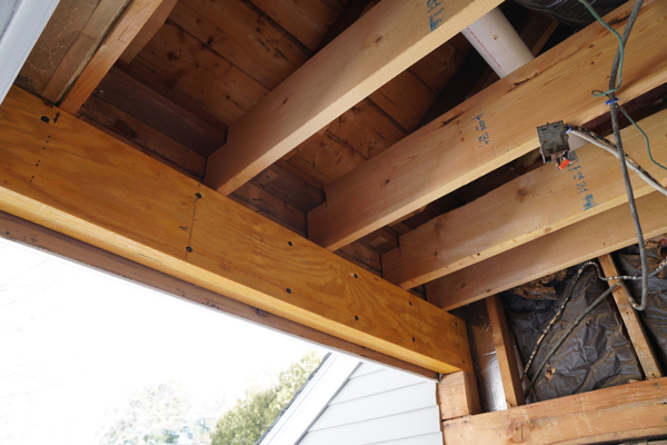 Once we determined that the second floor, above was rebuilt with doubled floor joists and rafters, making the outer porch roof-line bearing. To further support this structural roof-line, we installed a laminated veneer lumber [LVL] beam on the outer perimeter wall and framed it in. With this done we were free and clear to remove the inner, older, exterior wall.