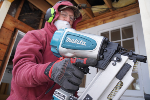 Additionally, to stiffen the wall more, I added two vertical studs to the end of the wall and ran them long, down into the floor area. I was able to tie these two 2×4’s into the floor joist below with some structural screws and some wood blocking. This stiffened up the end of the wall significantly.