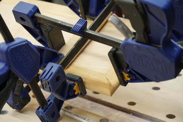 I apply glue to both edges and apply the nosing with clamps. During clamping I’m careful to ensure that the nosing is in line with the plywood face, and not tilted up tor down. I use a few brad nails at the miter corners, to hold the tight until the glue cures.