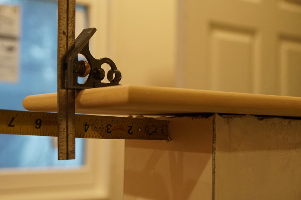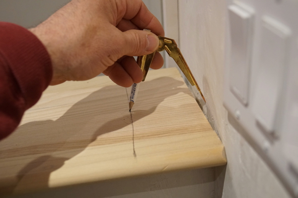The first order of business is to center the shelf and check the wall joint. Once centered you have your overhang measurement, and need to create that same overhang at the end wall.