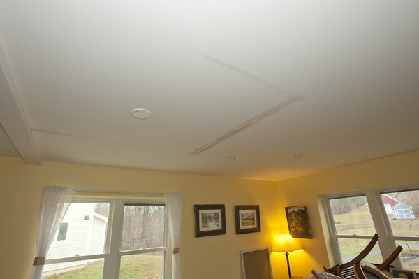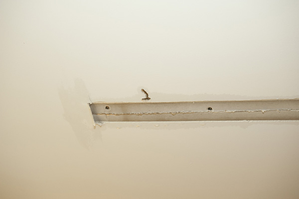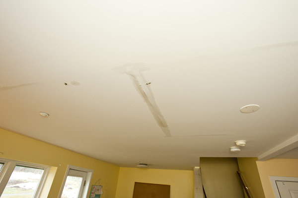 The panel will be painted to match the walls and screwed directly into the studs. Then patching the ceiling is a simple matter of cutting a panel of drywall and fitting it into place. Then re-taping any remaining water damaged seams. I’ll use setting compound because it’s stronger and will allow me to complete the process in one day instead of coming back three times, one for each coat.
