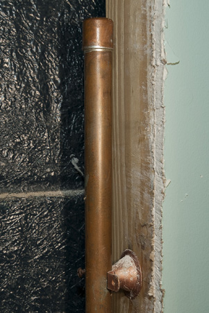 The leak was pretty evident in the living room, bubbled drywall tape and water dripping from the ceiling. Being a newer home that was built with a fire suppression system there was some concern that the water was coming from the fire suppression system. There had been some false alarms and readings of a low pressure problem from the control panel. But it could also be coming from the plumbing for the second floor bathroom. In either case the first thing to do is shut off the water, in this case both to the fire suppression system and the main coming into the house.