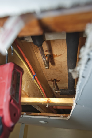 Once a bit of the ceiling was removed it was easy to tell that the water was not coming from the fire suppression system, because there was water coming down from a hole in the 2nd story sub-floor around the tub drain. But on initial inspection the tub drain didn’t look at all wet so this didn’t appear to be a drain leak. So I’m thinking it a supply line. OK so tear out a bit more of the ceiling and find a lot of water dripping from the supply lines, one in particular was dripping a lot, so that’s probably the culprit.