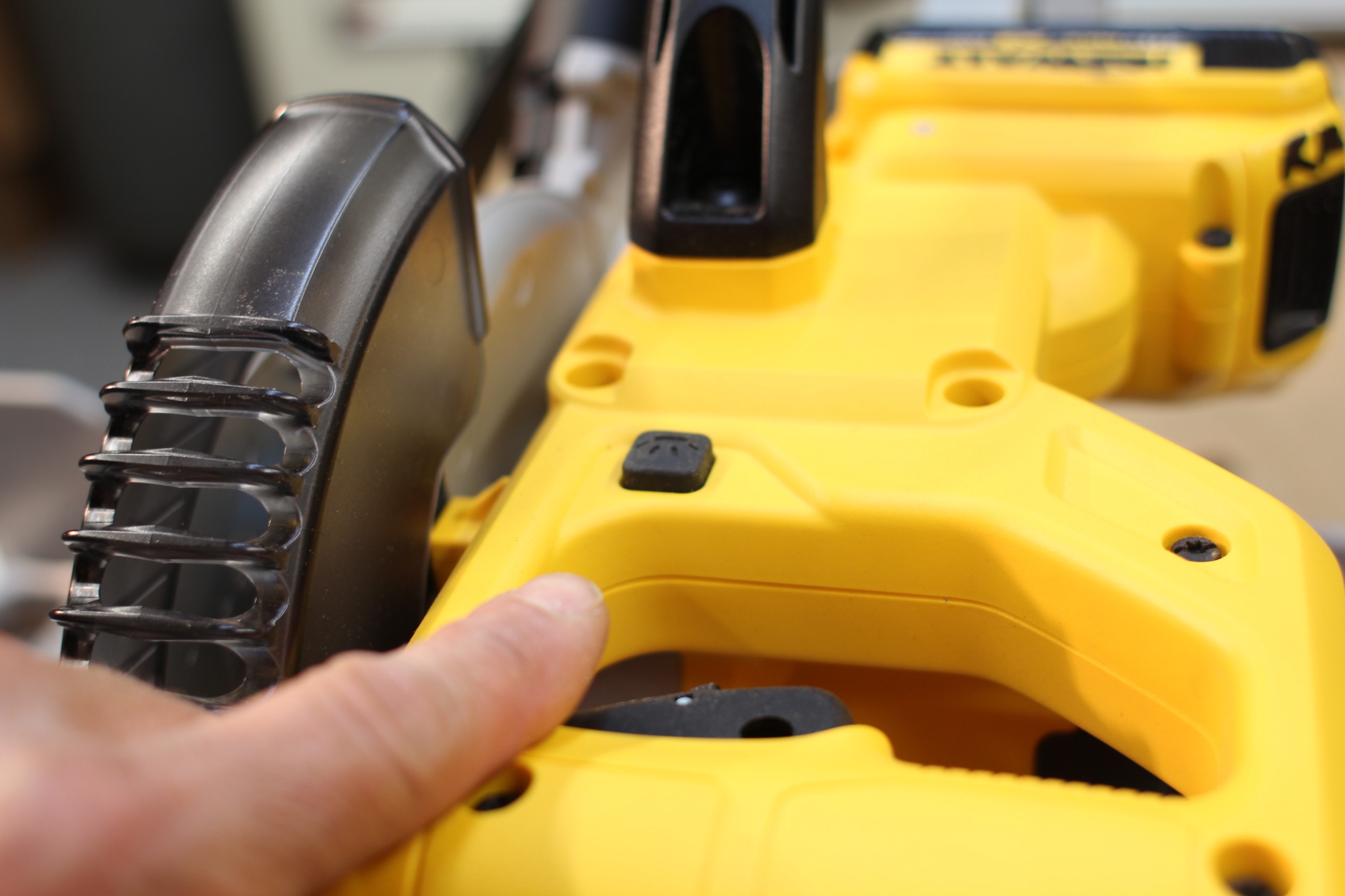 We were excited to see that the DEWALT 20V Cordless 7 1/4 Inch Miter Saw DCS361 comes with the XPS Cross Cut Positioning System. The XPS system is powered by a separate switch, located on top of the tools handle, which is helpful if you want to check a cut without powering up the saw. An LED light casts a shadow over the blade, indicating the line of cut. Our crew likes this feature over a laser because there is no need to align the light and it works on any size blade.