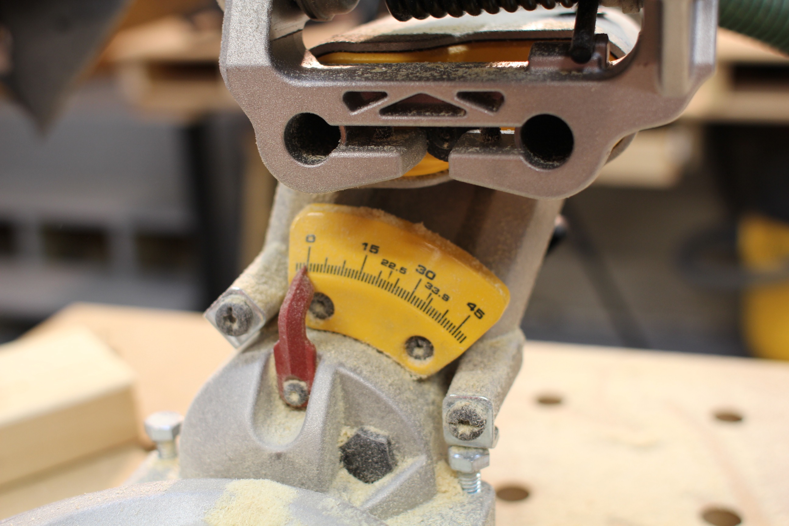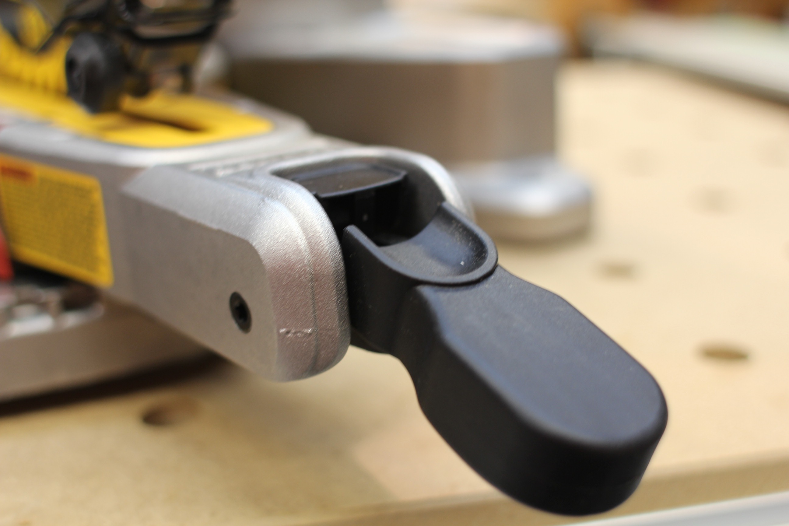 A large, and in charge, cam lock with a push button release controls the miter angles. We found this saw has intuitive design principles. This cam lever is a perfect example of simple, easy to use and natural movement.