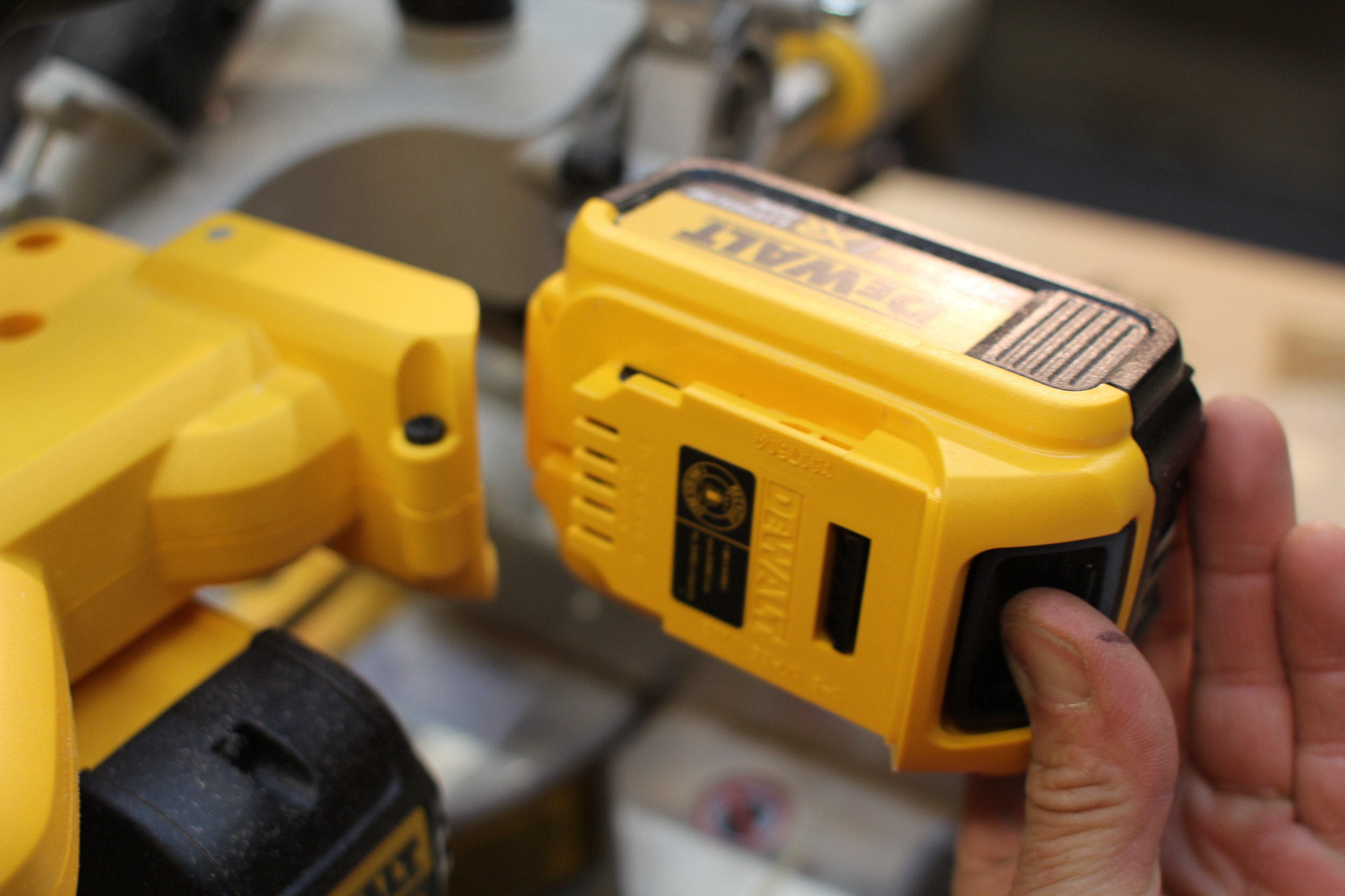 The DCS361 Miter Saw has an electronic module that monitors the battery and senses low voltage. When the battery drops to a certain level the XPS light will blink when the trigger is pulled. This alerts the user that the battery will be shutting down after 4-5 more cuts.