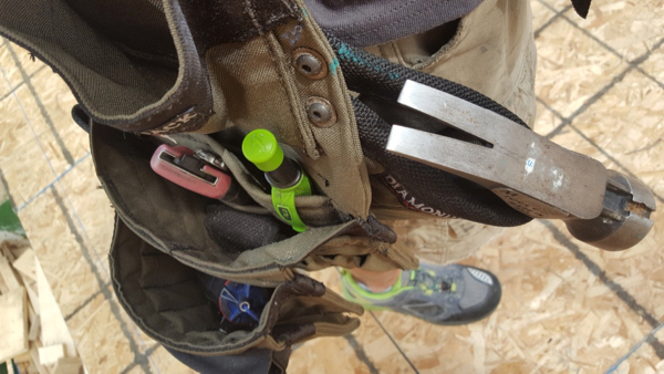 The Elias pouch is more on my dominant side where I mainly keep hand tools, a pencil etc. At the bottom of the Elias pouch there is a Velcro enclosed pouch that is useful for valuables, drill bits, or even an extra battery. Underneath the Elias I have the hammer sleeve. This sleeve is quick way to access my hammer.
