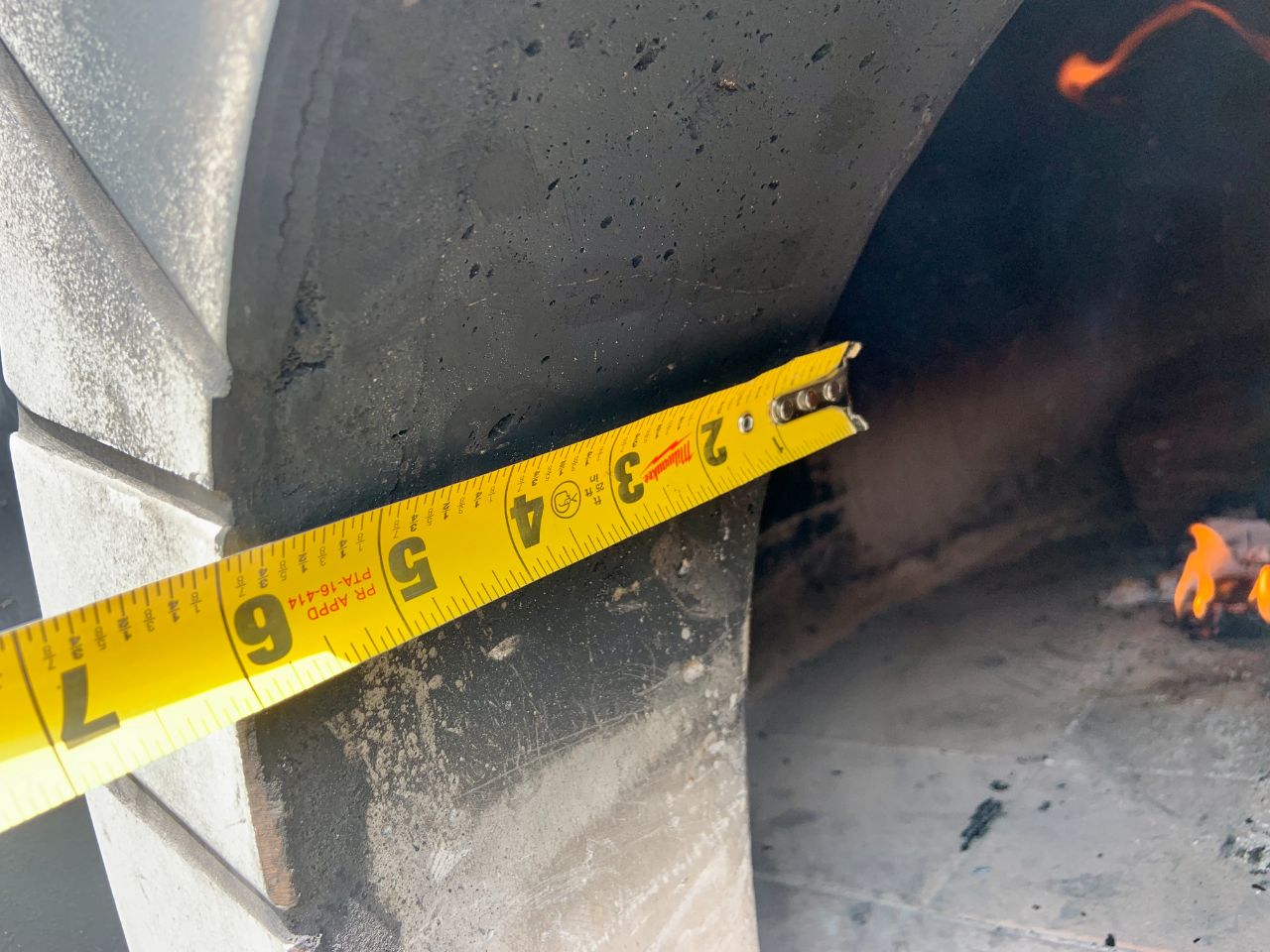 The Dome Oven opening begins at about 4-1/2″ and widens to almost 6″ thick. The wall of the dome measure’s slightly over 4″ which makes for a well-insulated oven.