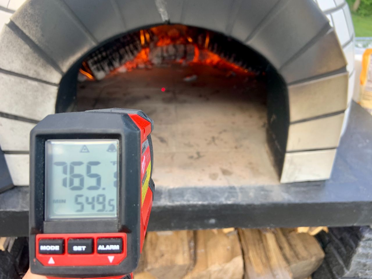 When cooking I prefer a really hot oven to get that “char.” Below you can see a reading of about 765°F . I know from experience that a larger fire will get the brick’s temperature even hotter.