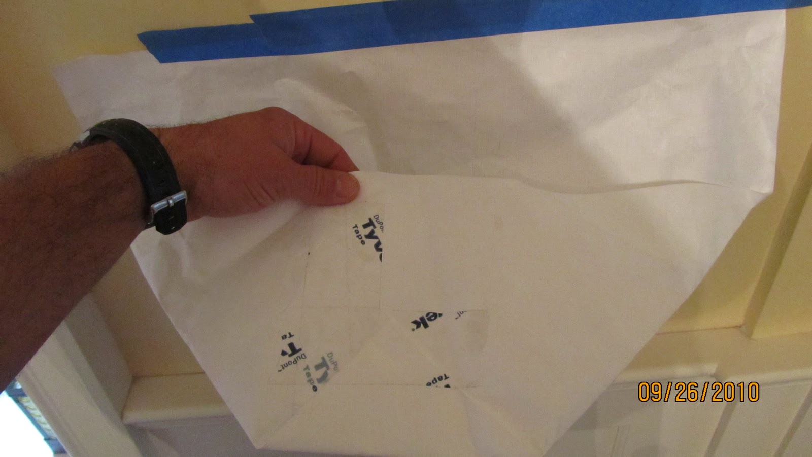 George took a scrap piece of Tyvek housewrap but you could also use a paper grocery bag. He folded the bag to make a pocket, using tape to hold it together. He then used blue painters tape to tape his dust free drilling solution under each hole he was drilling.