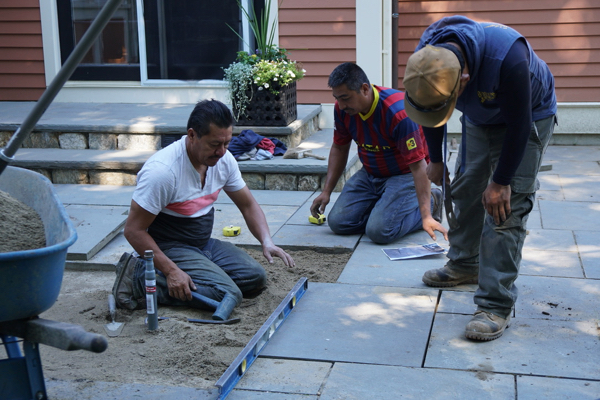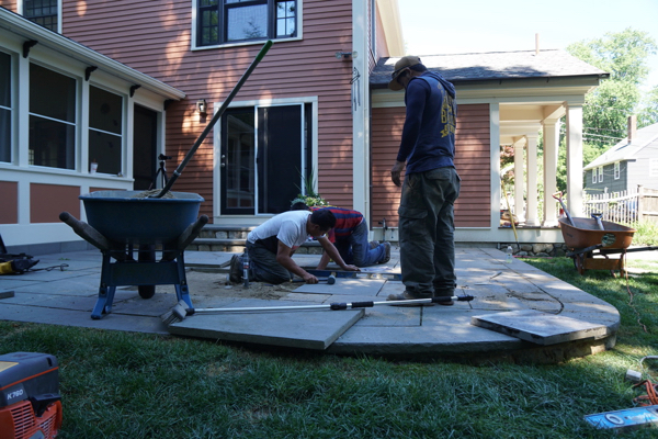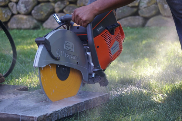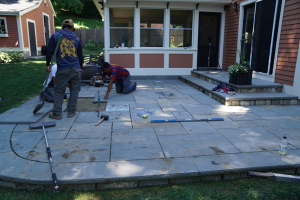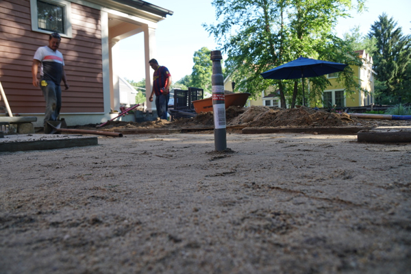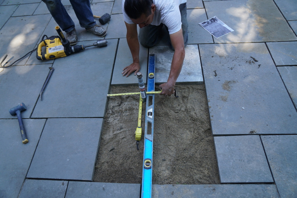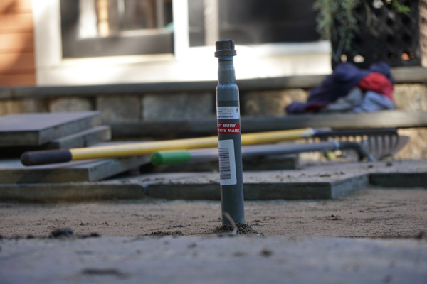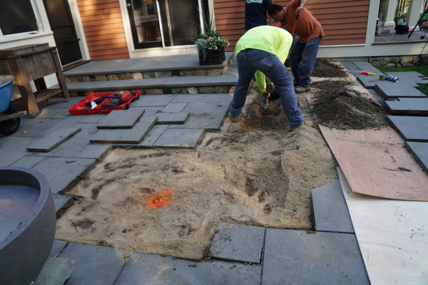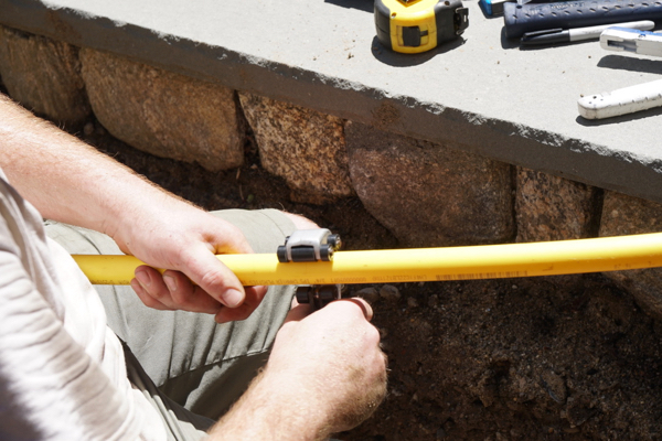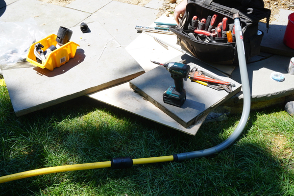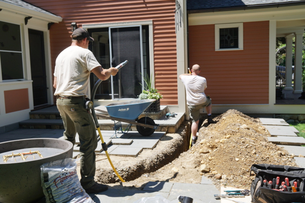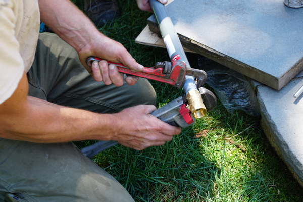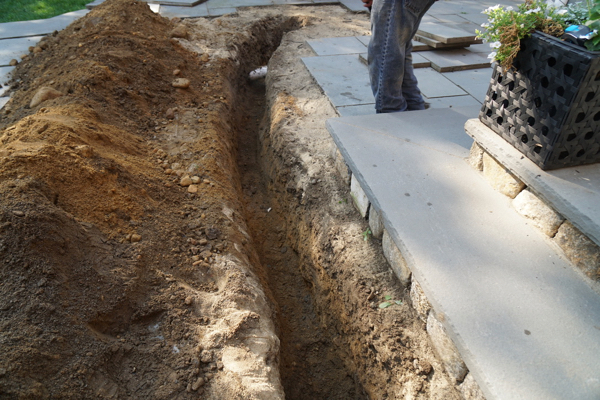 It requires a minimum of a ¾” diameter gas line, installed in a home-run fashion from the house. Our plan was to take up the blue stone, dig an 18” deep trench for the gas line to travel through. This gas line needs to have a shut off that is separate, and accessible than the one on the fire bowl. We decided that the gas line would transition up from the patio at the house, with a shut-off valve at the foundation wall. The pipe would then penetrate the house foundation and connect to the interior gas supply.