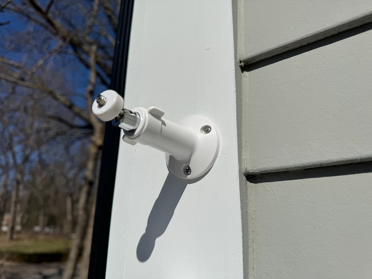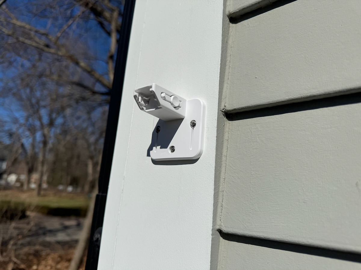 The solar panel is connected via a USB-C cable that has a flared rubber fitting to protect the port from water and the elements. The solar panel has a separate mount that can be located around a corner or above a ledge to achieve optimal line of site for solar charging.