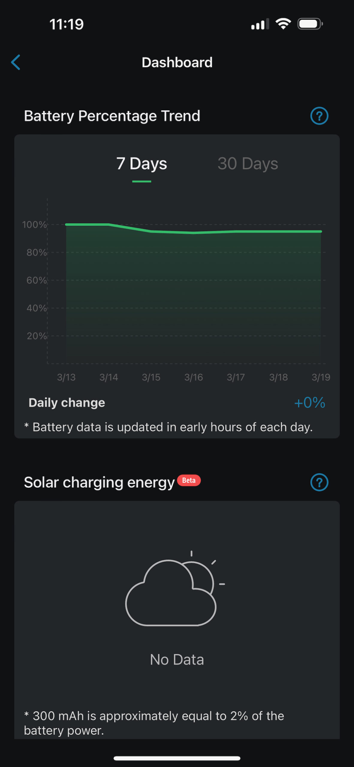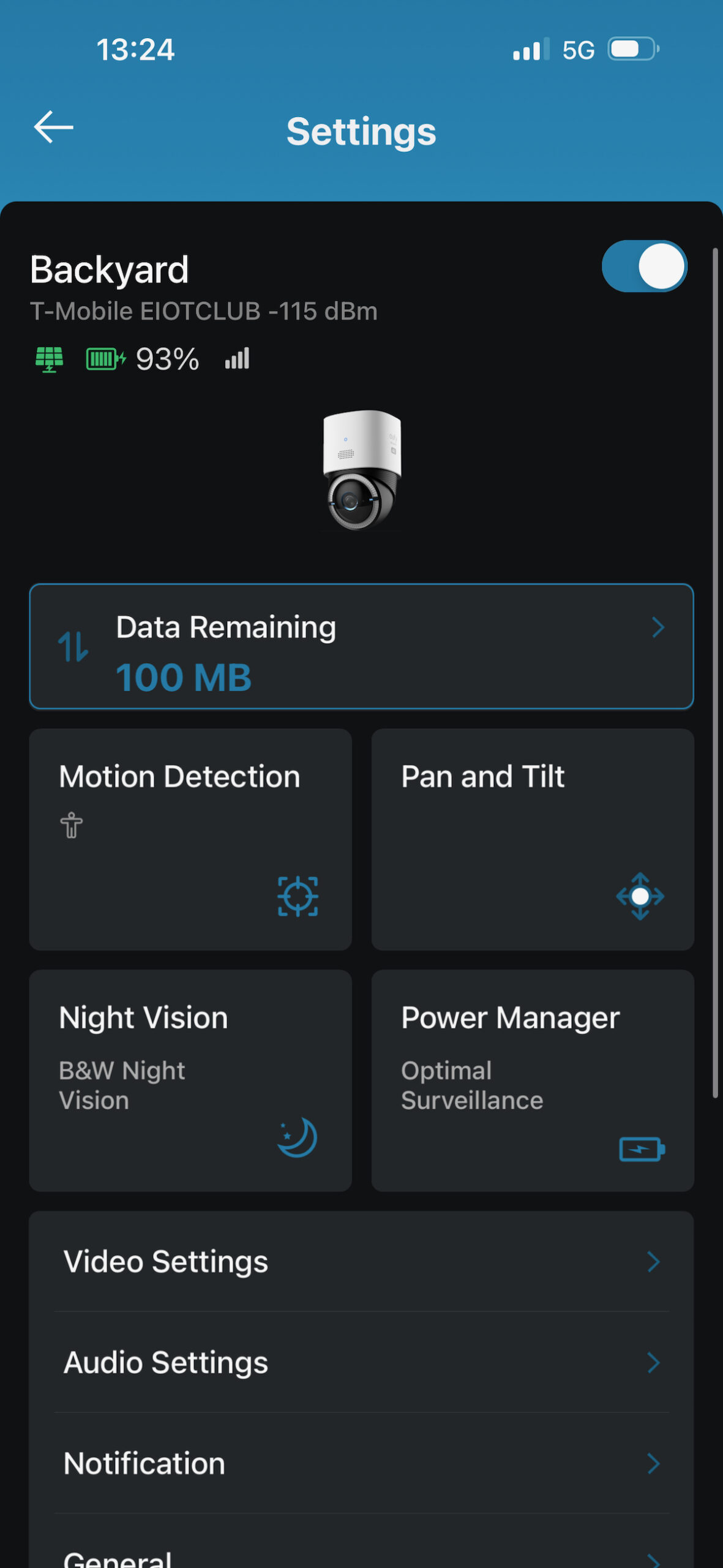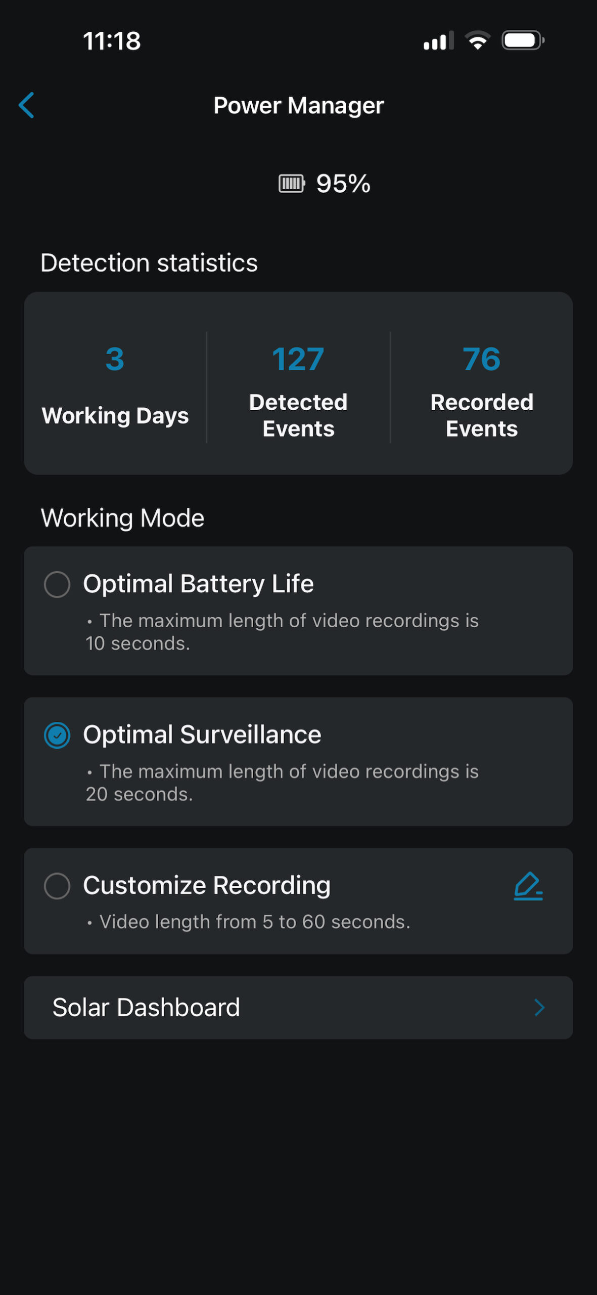 During our testing over one week, the battery levels never dipped below 95%. The camera was set to its “Optimal Surveillance” setting that prioritizes longer video recordings and thus higher power drain.