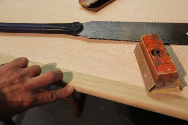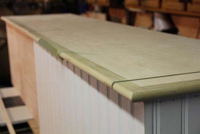 The other day I was making a paint grade window seat for a client.  I was about to crosscut the window seat lid on my table saw and when I was positioning it the nosing came in contact with the blade and left a saw kerf in the wrong spot – Oops!