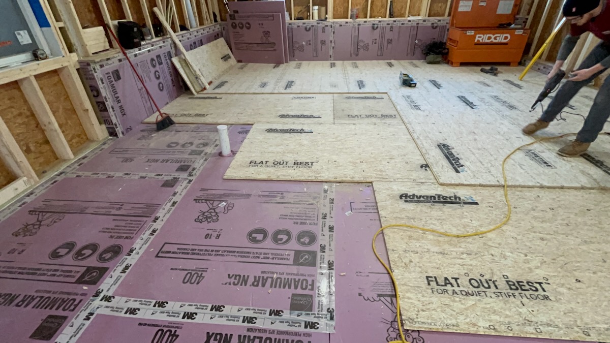 The result was a strong and stiff subfloor without having to install sleepers that might loosen, squeak, or twist over time. The big win for us was achieving a thermal break with R-10 insulation value and a continuous vapor barrier.