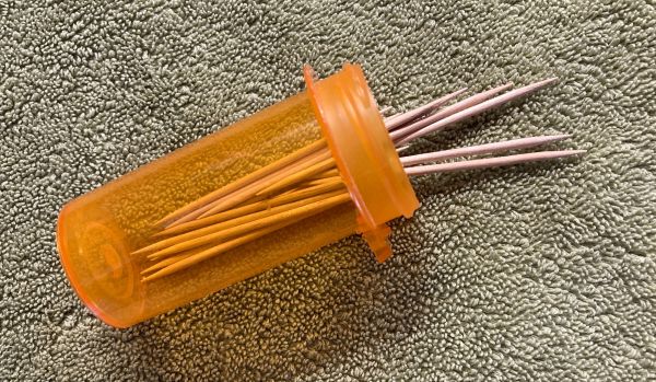 It’s not uncommon to have a screw in wood get loose as the part moves around or ages.  Sometimes you can just use a slightly larger diameter screw to fix the problem.  Sometimes that’s not feasible and you want to reuse the existing screw.  By sticking a toothpick or two into the existing hole you can often shrink it enough that the old screw will now hold tight.  This works more often than it doesn’t in my experience.