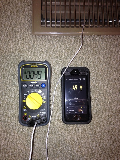 The thermocouple probe allowed us to measure the temperature at each vent of the central air to compare. Once again, the wire jack terminal fit snug on the multimeter. The TS04 gave quick accurate readings and let us move from project to project on site faster because everything was being recorded for us on the ToolSmart app.