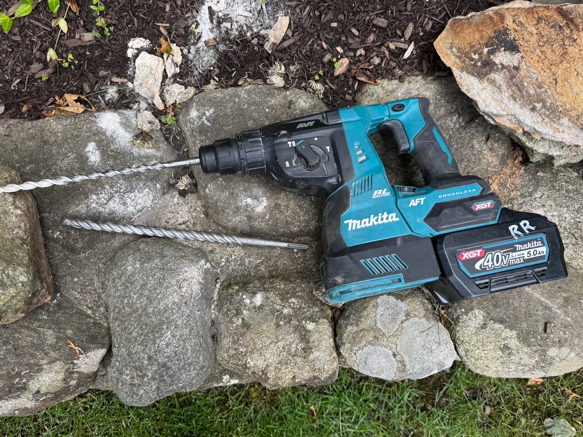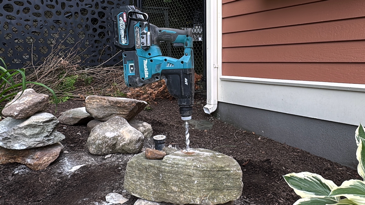 Using an SDS rotary hammer drill, I started with a pilot hole through each rock, first with a 3/8” masonry bit and then following with a ⅝-inch masonry bit to widen the hole. The larger hole gave me enough clearance to slide the rocks down over the ½-inch rebar during assembly.