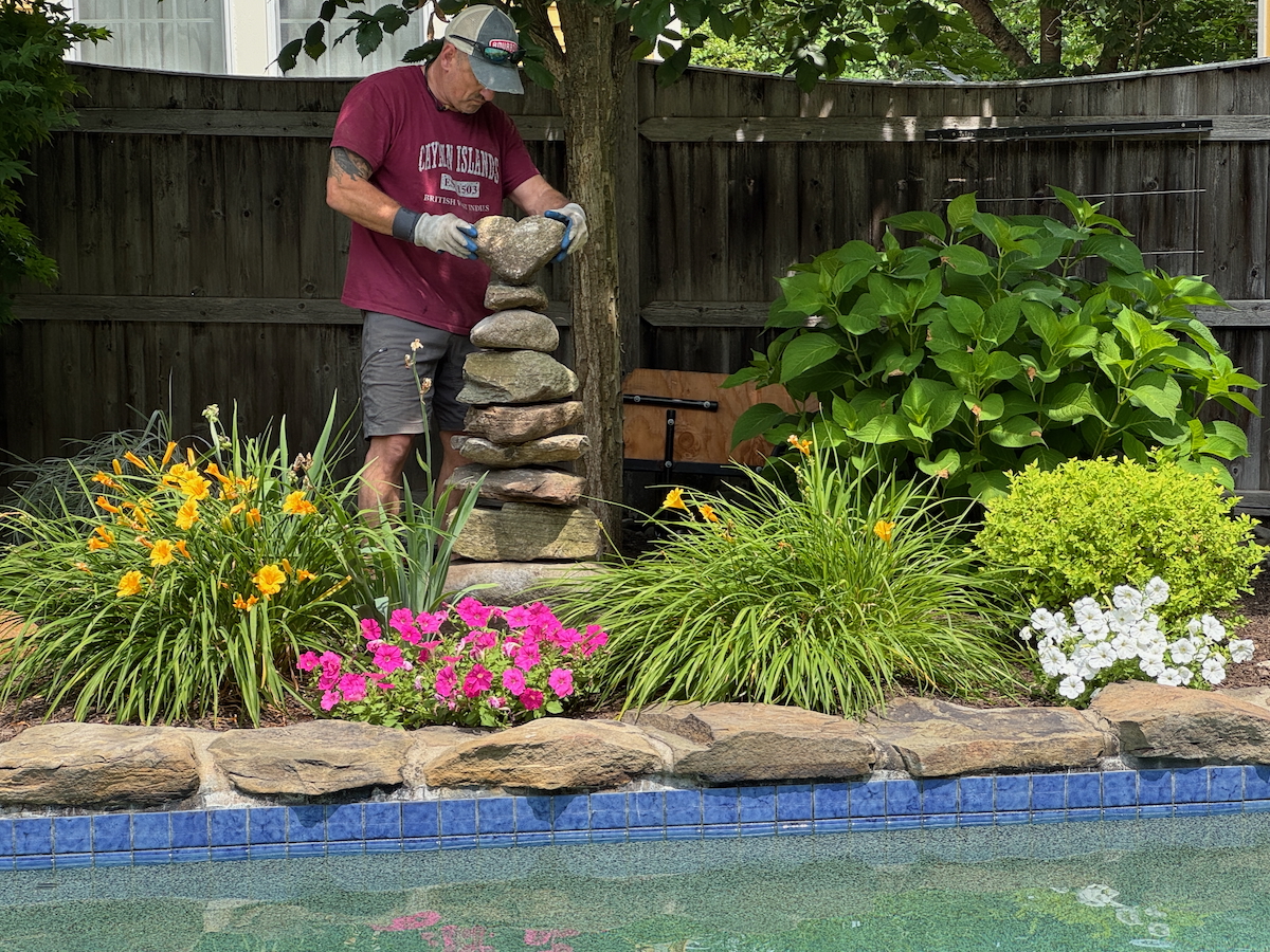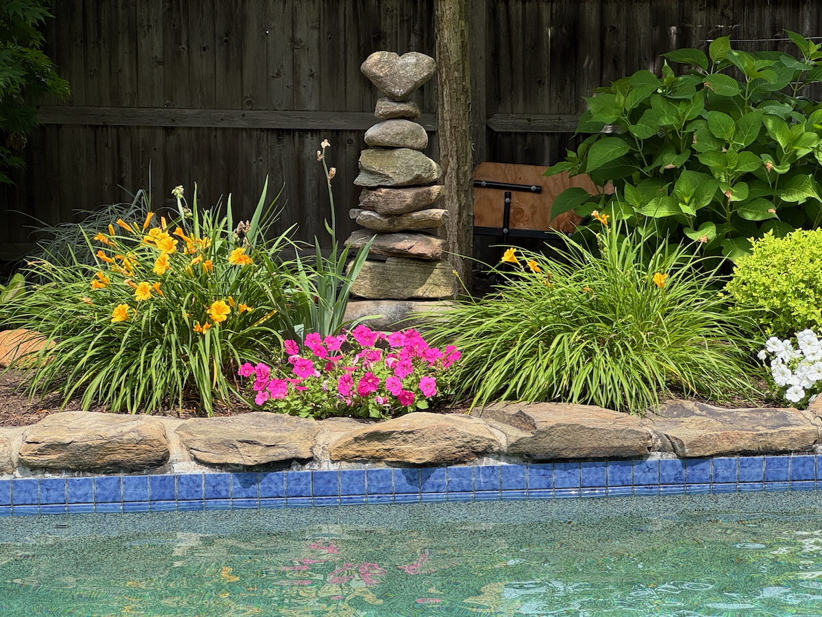 I sorted through the pile and selected rocks that gradually descended in size—from large base rocks to smaller ones ending at the top. I wanted the finished cairn to be about 3 feet tall, tall enough to stand out behind lower-growing flowers along the pools edge.