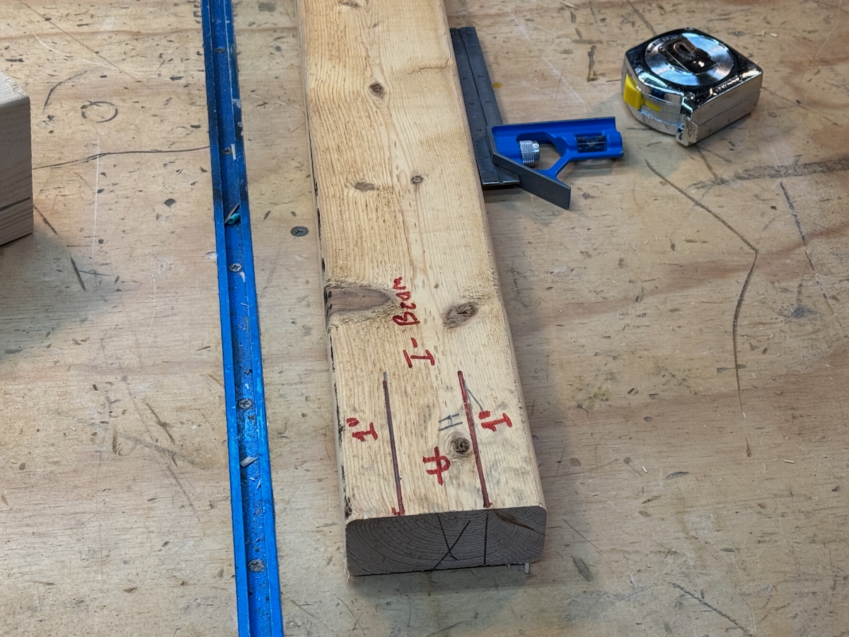 1. Build I-Beams: Sandwich a 30-inch 2×4 between two 30-inch boards, centered with 1-inch overhangs, and secure with screws.