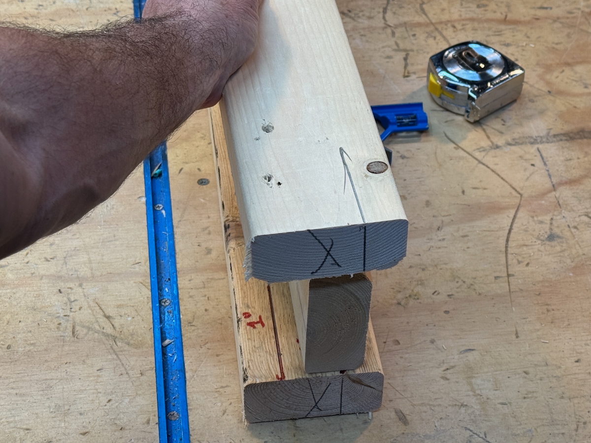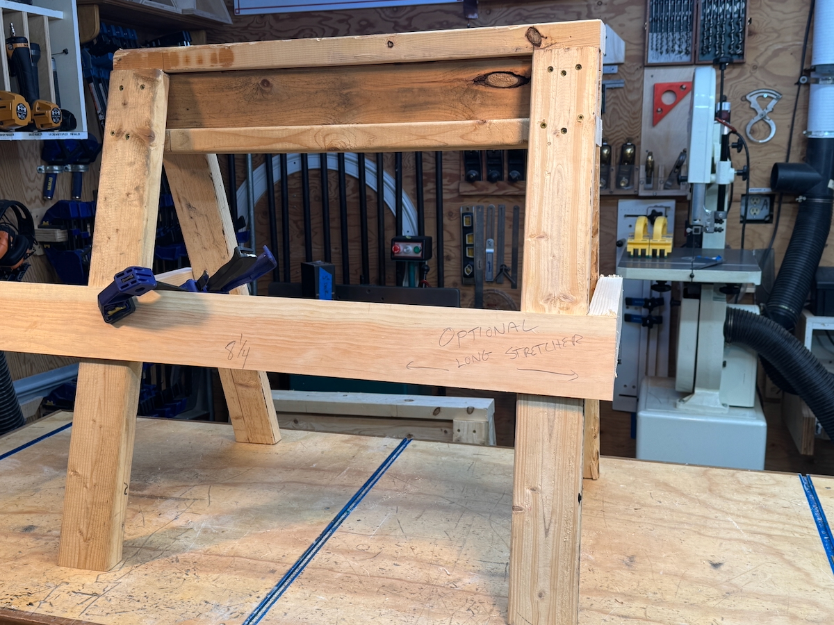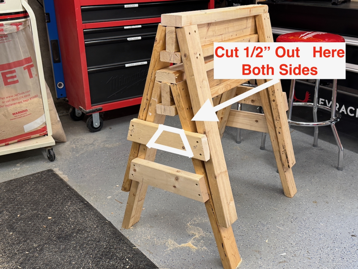 If you plan to add side stretchers, you’ll need to adjust the length of one set of horses to accommodate the additional material. To do this, make one sawhorse longer than the other to prevent interference with stacking.