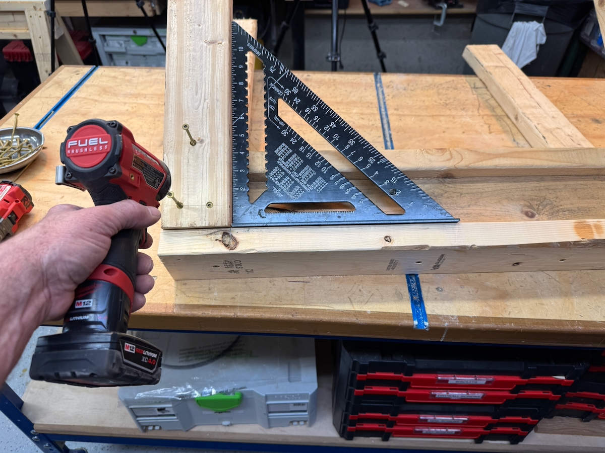 2. Attach Legs: Angle the 30-inch legs under the I-beam’s lip and screw each in place with four screws. Use a Square to keep the legs square to the I-beam.