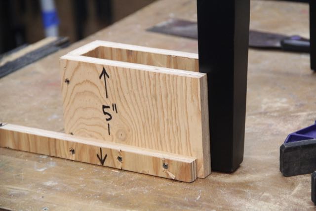 I used scrap plywood and ripped it to the height that I wanted to cut off the stool legs. In my situation, I ripped the plywood to 5” wide. Once ripped I then cut it into 3 pieces to make my cutting jig.