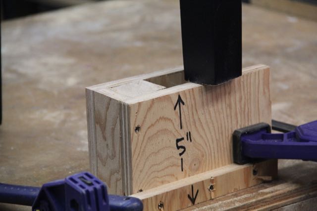 I used cut offs of the 5” ripped plywood and half-lapped them to make supports or “stilts,” for the legs once I cut them down. The support stilts are clamped to the legs after cutting them down, and keep the chair from wobbling or falling down while you’re dealing with the next cut.