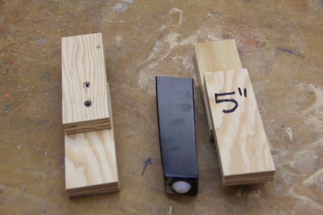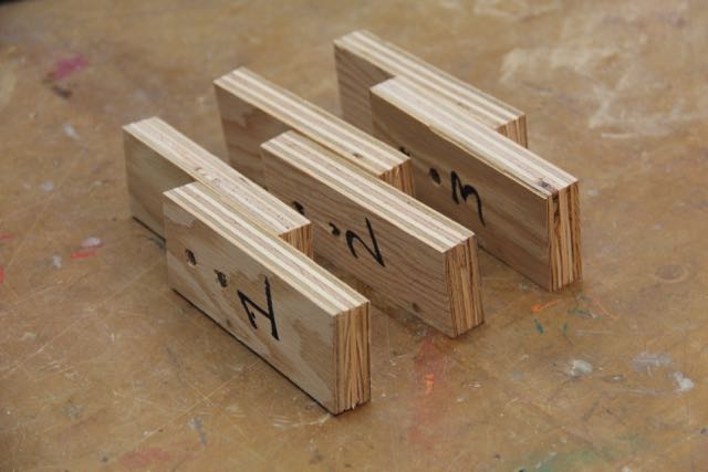 I used cut offs of the 5” ripped plywood and half-lapped them to make supports or “stilts,” for the legs once I cut them down.  The support stilts are clamped to the legs after cutting them down, and keep the chair from wobbling or falling down while you’re dealing with the next cut.