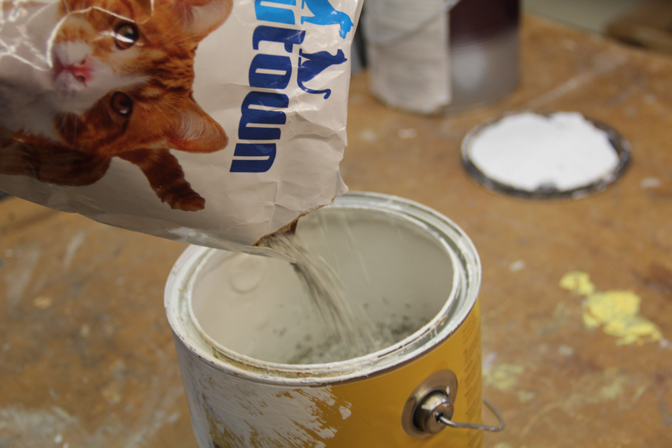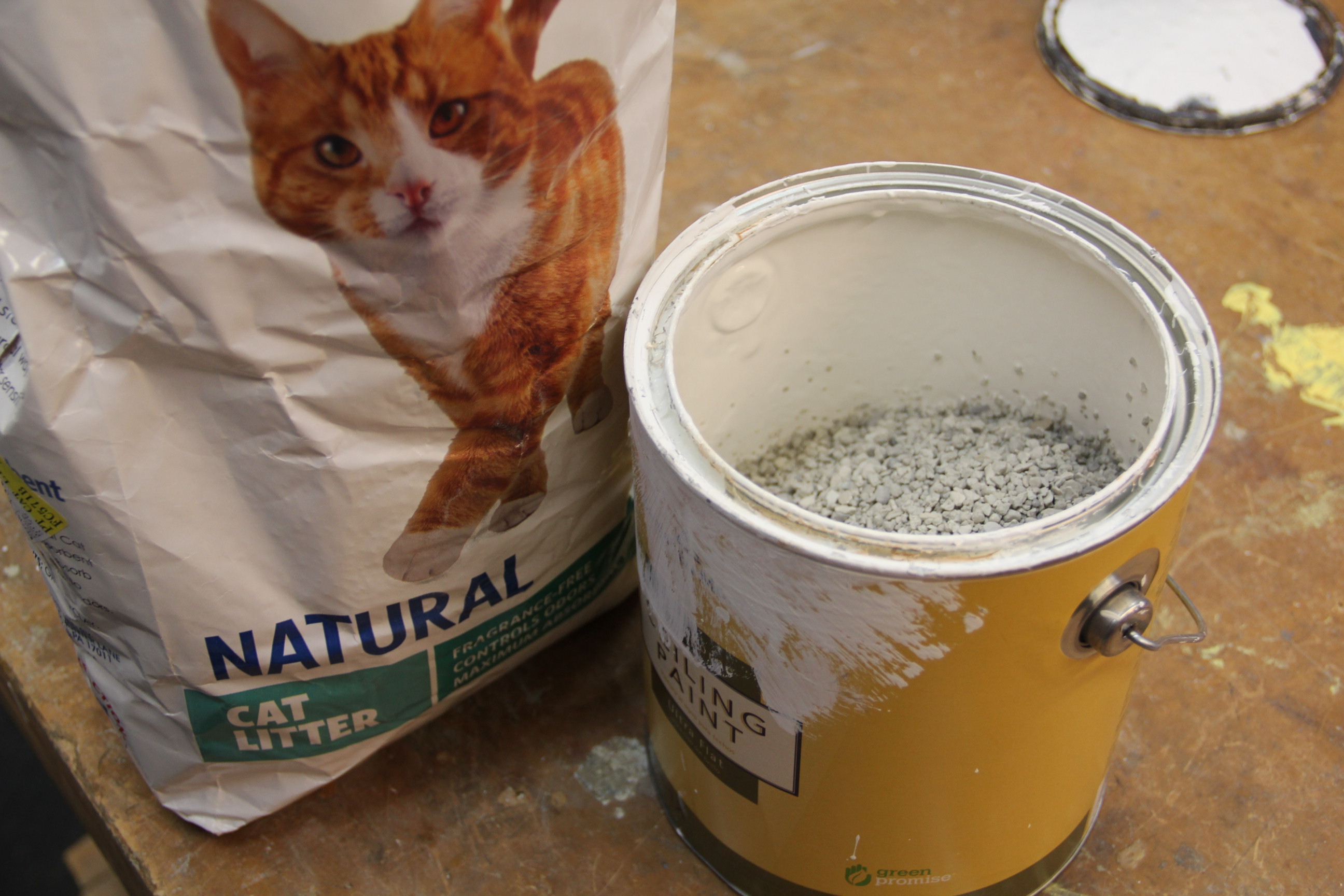 For larger amounts of latex paint, mix equal parts cat litter into the latex paint can. If you have more than a half a can, you can also pour the paint into a 5-gallon bucket for mixing.