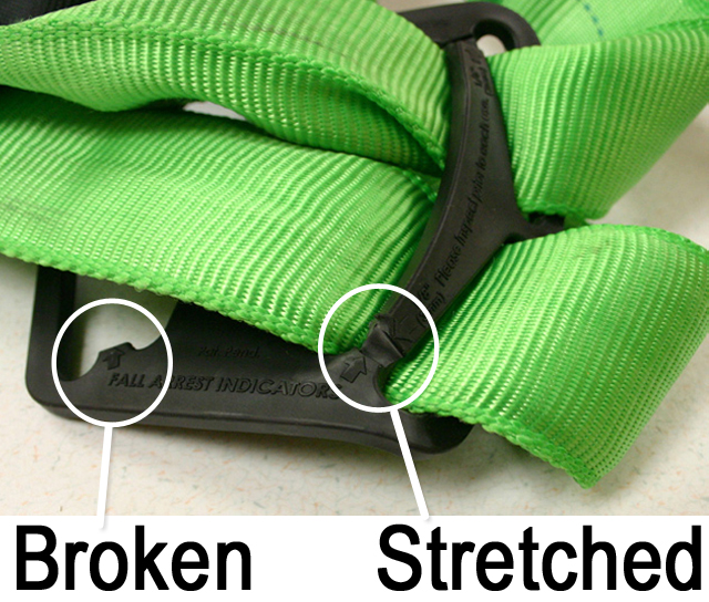 Lastly inspect the fall arrest indicators built into the harness. On the Miller there are 4 sets of arrows that should be touching. Stretching or breakage of the plastic is an indicator that the harness has been in a fall situation. Even if the rest of the harness is in great shape, remove it from service if the arrows don’t line up.