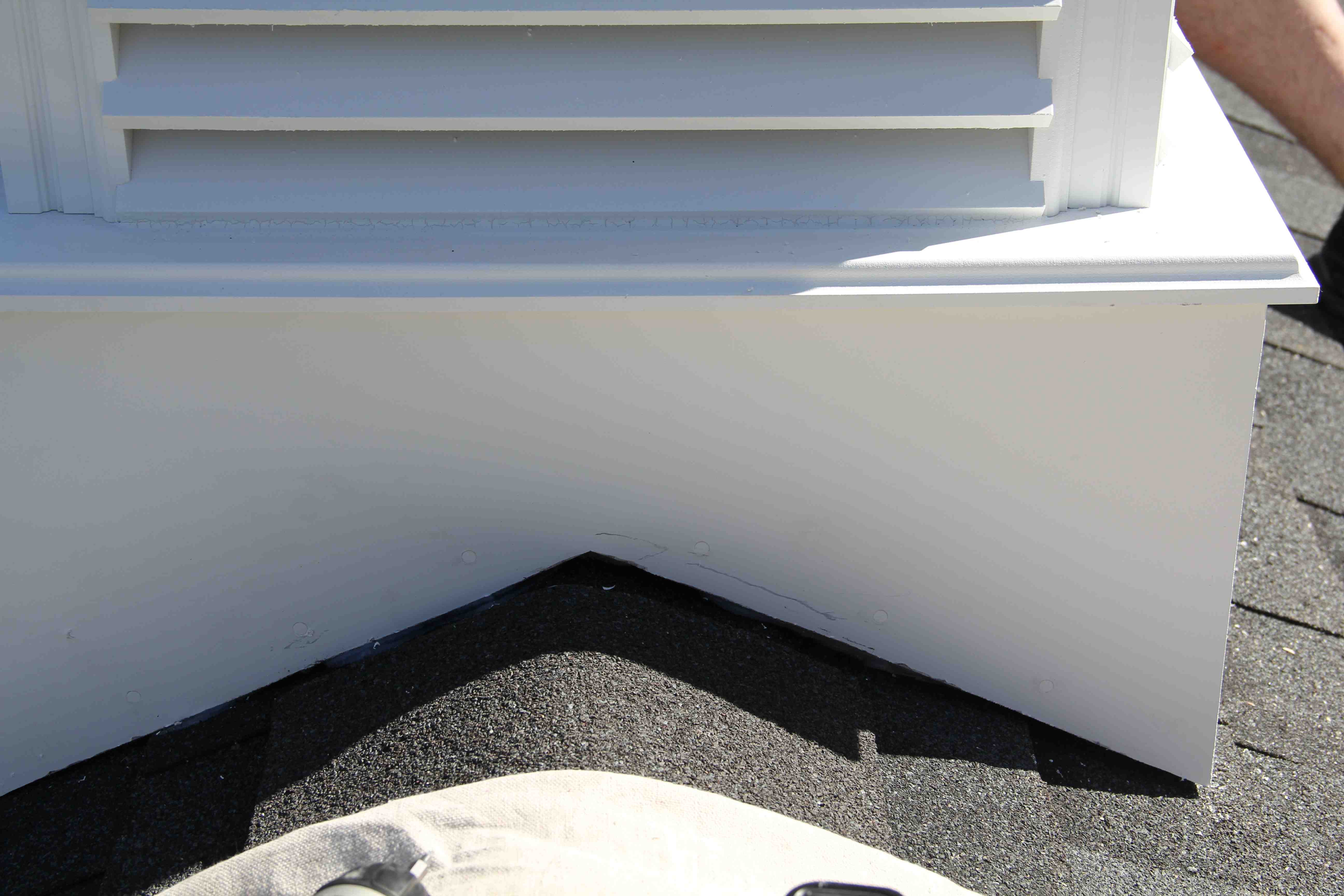 Apply silicone only to the seams that straddle the ridge and are fastened to the mounting blocks. This will keep angled water from getting under your cupola and getting to your mounting blocks. Leave the lower pitches roof edges open to drain any wind driven snow or moisture that may make its way under the louvers. Use the ridge shingles that you removed, if in good condition, to make any additional patches or to cover and roofing you removed.
