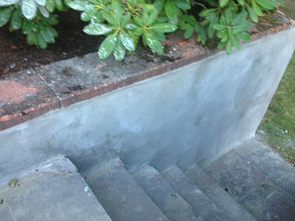The first step in stuccoing walls is to prep them correctly. You need to make sure you remove any crumbling blocks and loose debris. Chip away and piece that may stick out further then others to ensure you have a nice flat service. Clean off the walls with a brush removing all the dust and dirt. In cases like mine the walls had some pieces of block that were completely missing due to poor drainage. Fill them in with some mortar and let it dry. You want to make sure you are as close to level / flat as possible before you start applying the Stucco.