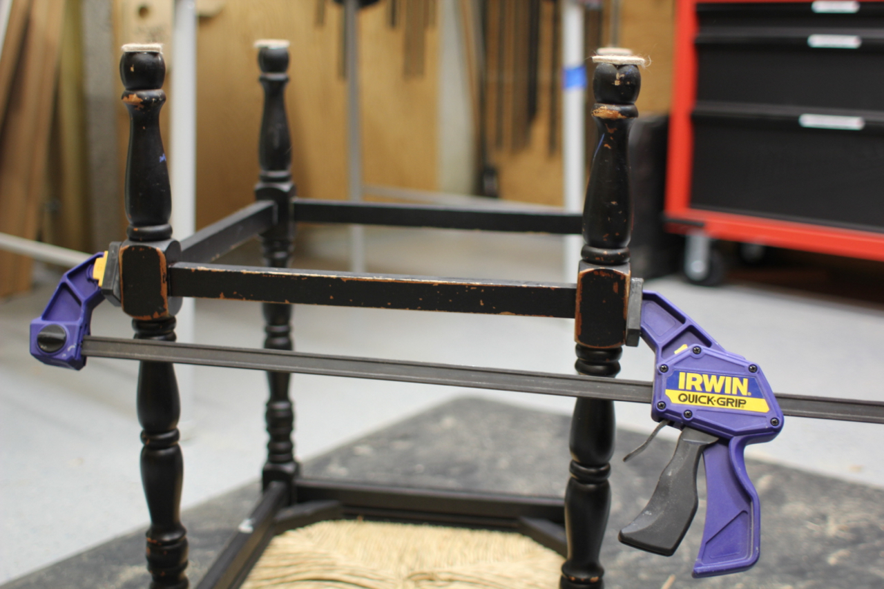 Two clamps hold the stretchers in place while the glue dries. If you glue infrequently, it is nice that Gorilla Glue has a long shelf life — three years as opposed to one, as with many other polyurethane glues.